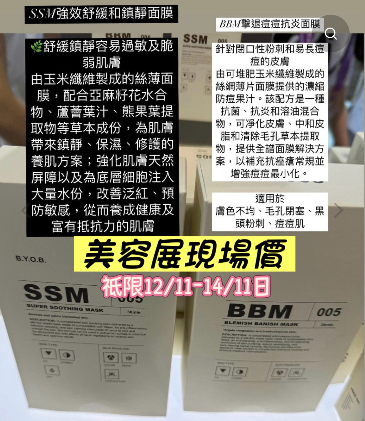 祇限三日 byob SSM面膜 / BBM面膜 SSM 強效舒緩鎮靜面膜 $150 BBM 擊退痘痘抗炎面膜 $150