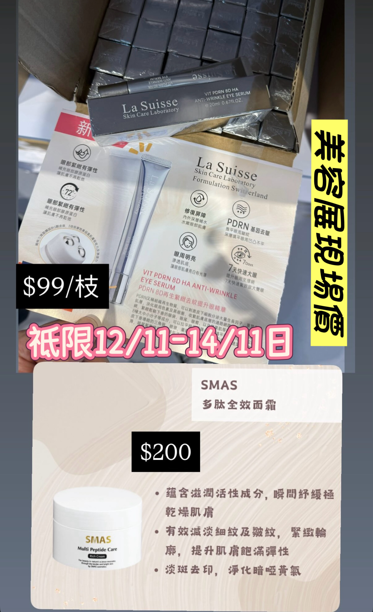 祇限三日 SMAS 多肽全效面霜 $200 La Suisse VIT PDRN 8D HA ANTI-WRINKLE EYE SERUM PDRN 8D再生紧緻去紋提升眼精華 $99
