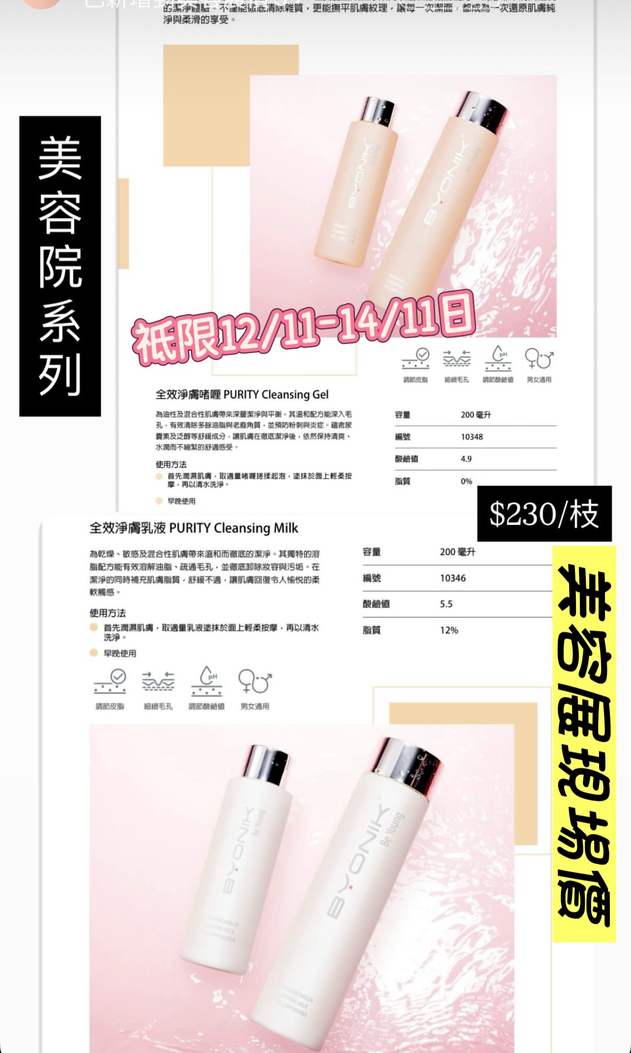 祇限三日 byonik 全效潔淨洗面系列 全效潔膚啫喱 $230 全效淨膚乳液 PURITY Cleansing Milk $230