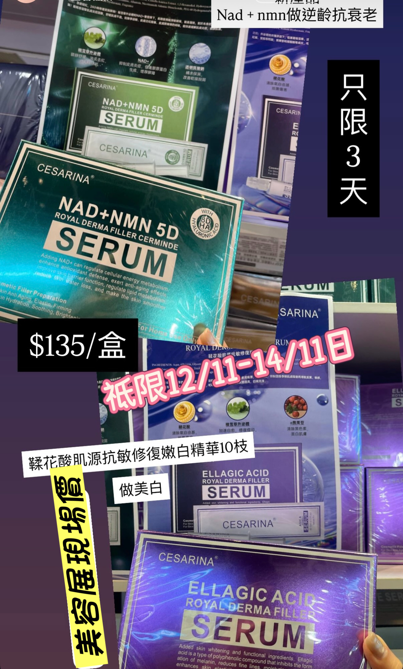 祇限三日 cesarina系列 (綠)8D nad屏障急救退紅修復精華10枝 $135 (紫)鞣花酸肌源抗敏修復嫩白精華10枝 $135
